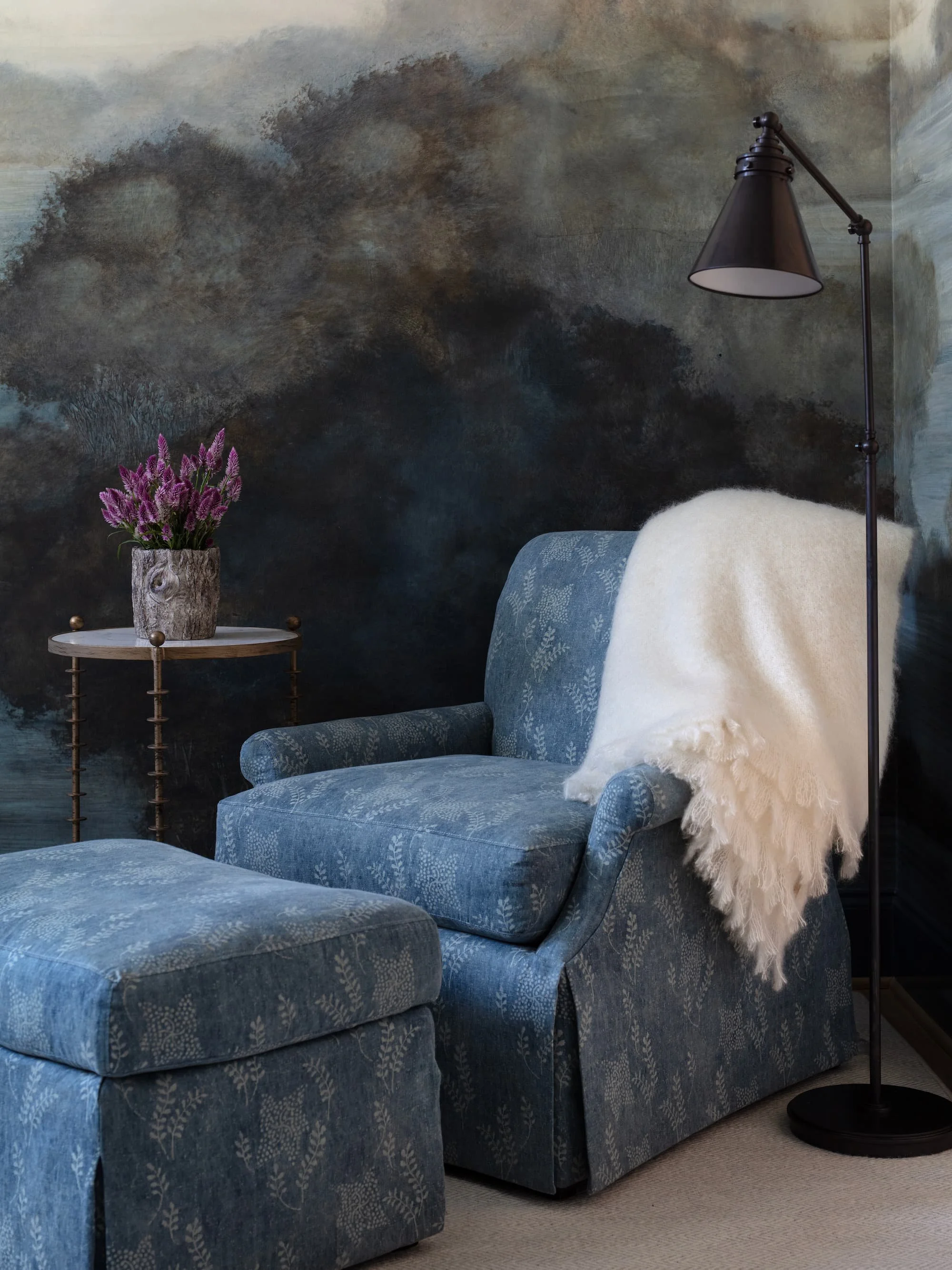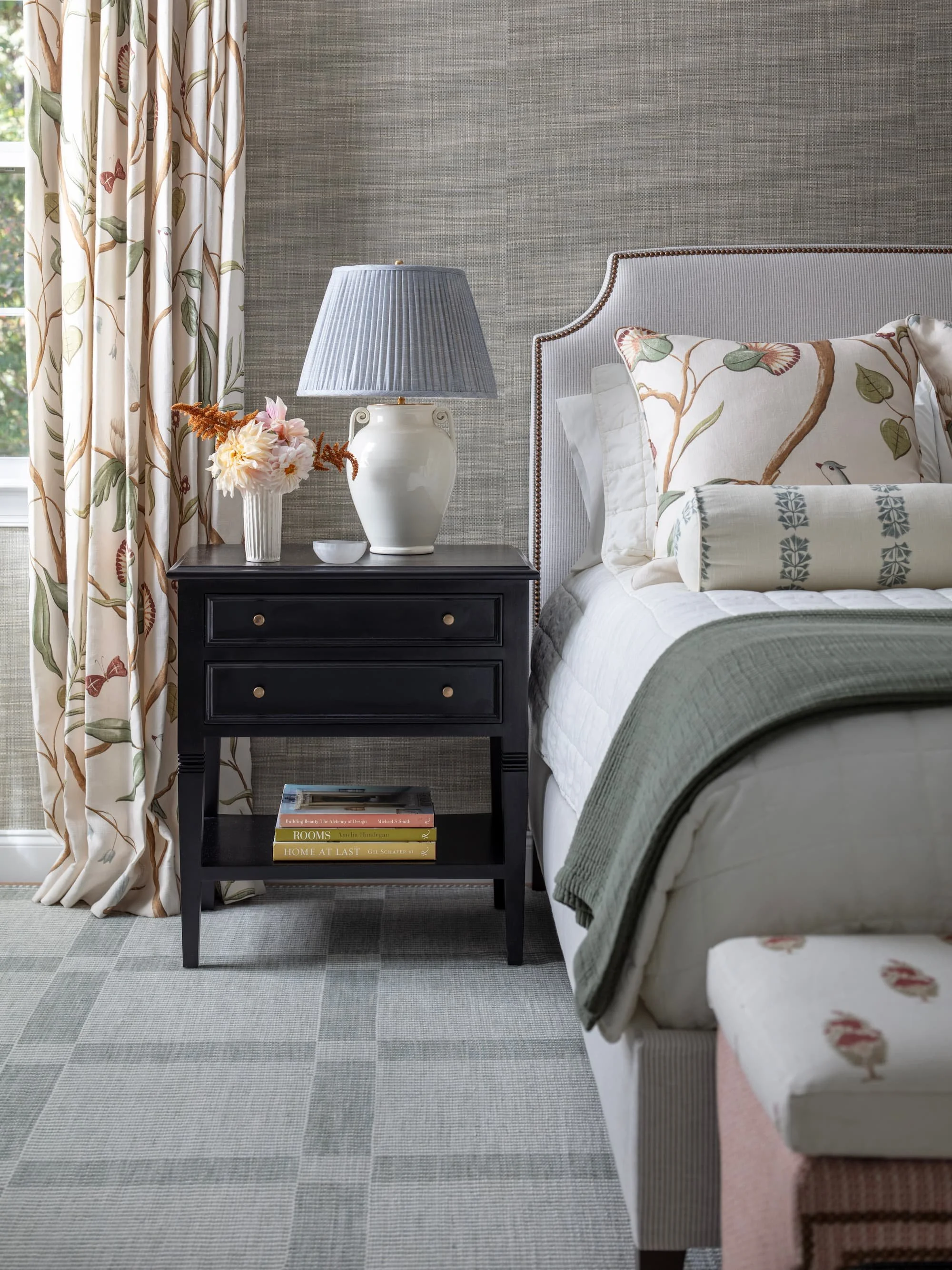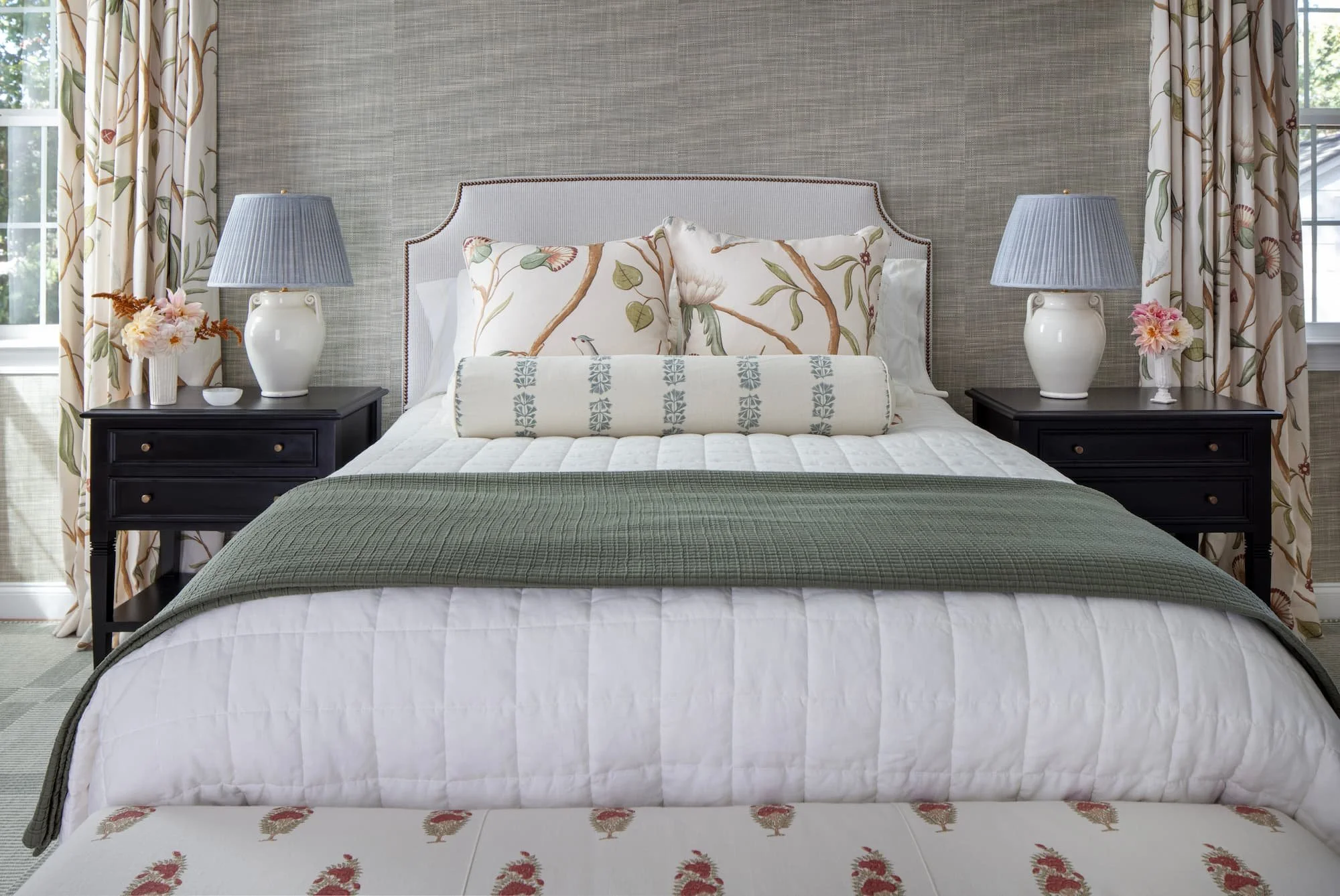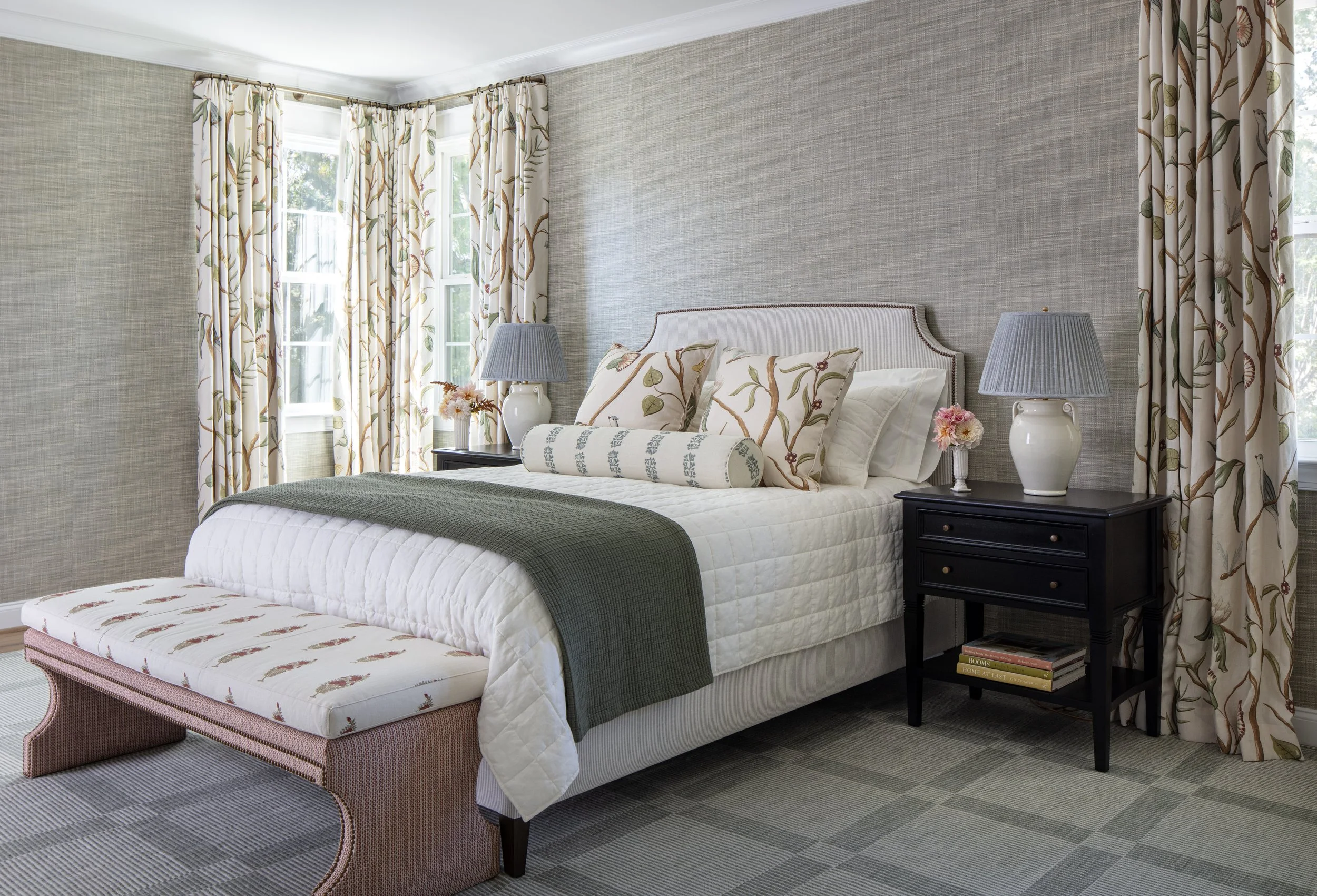 The primary suite is a calming retreat with walls wrapped in a pale blue paper weave. A favorite large scale botanical fabric frames the windows and grounds the layers of textiles used to create this cozy and collected space.