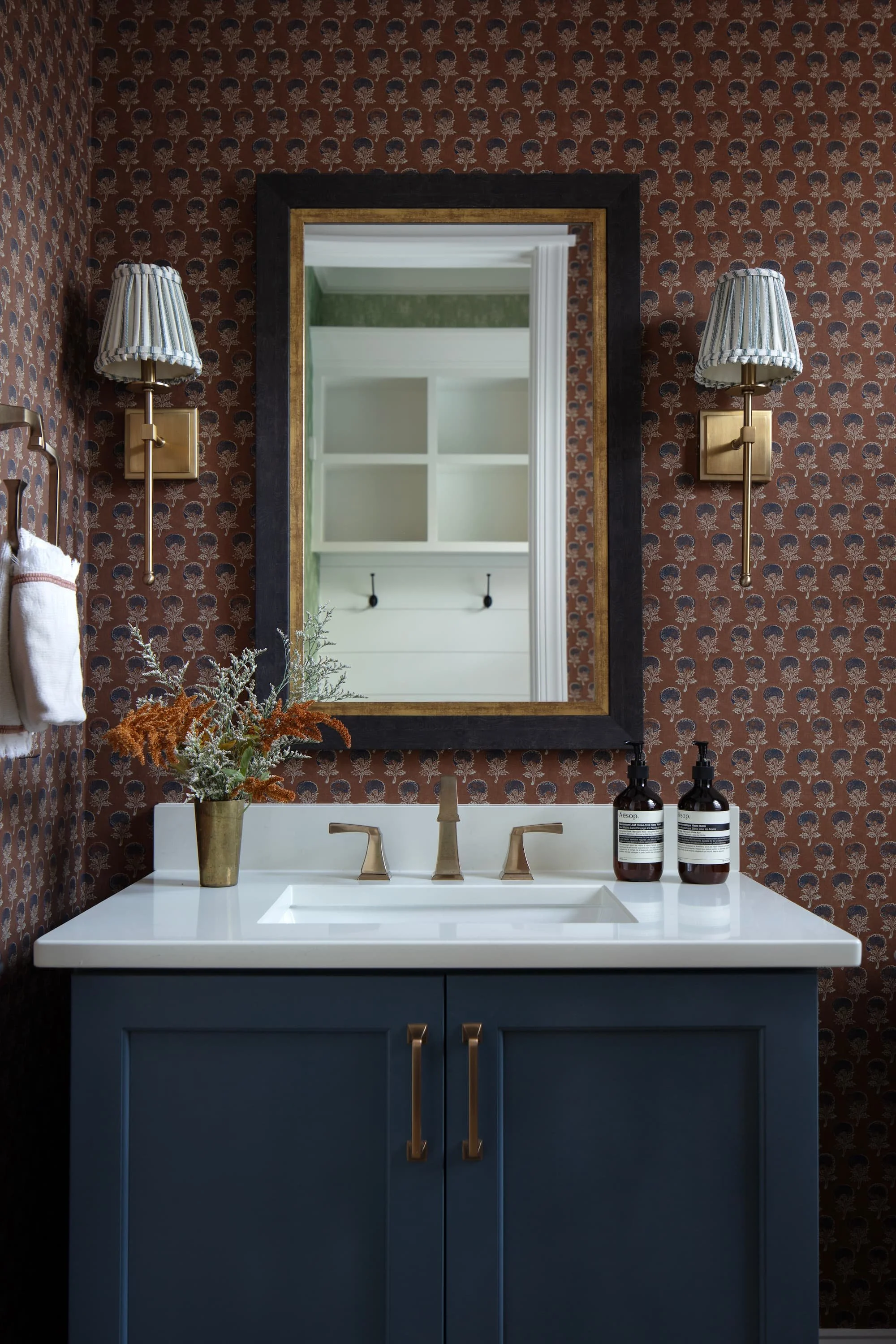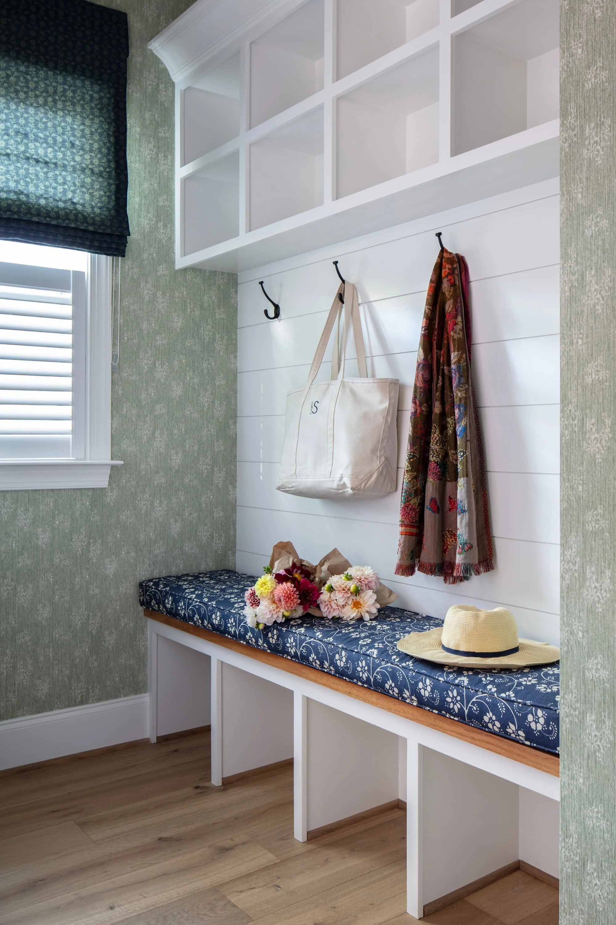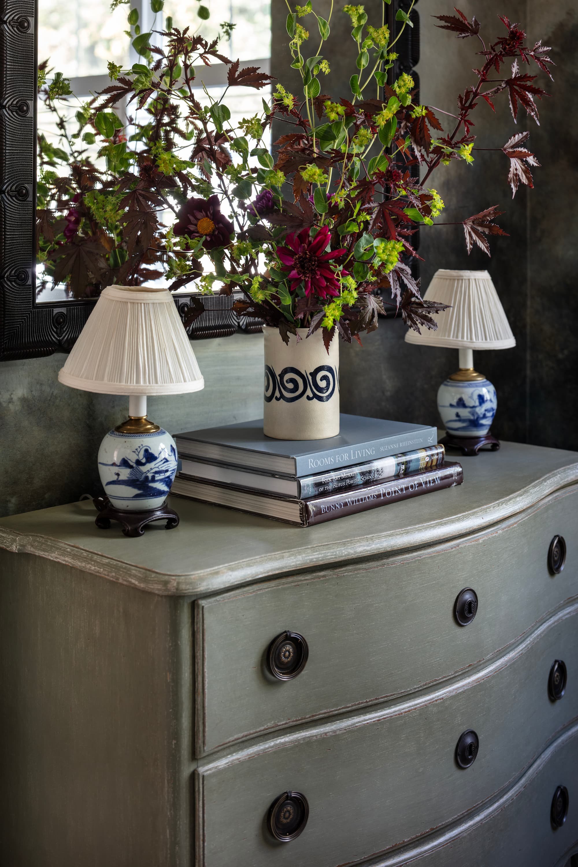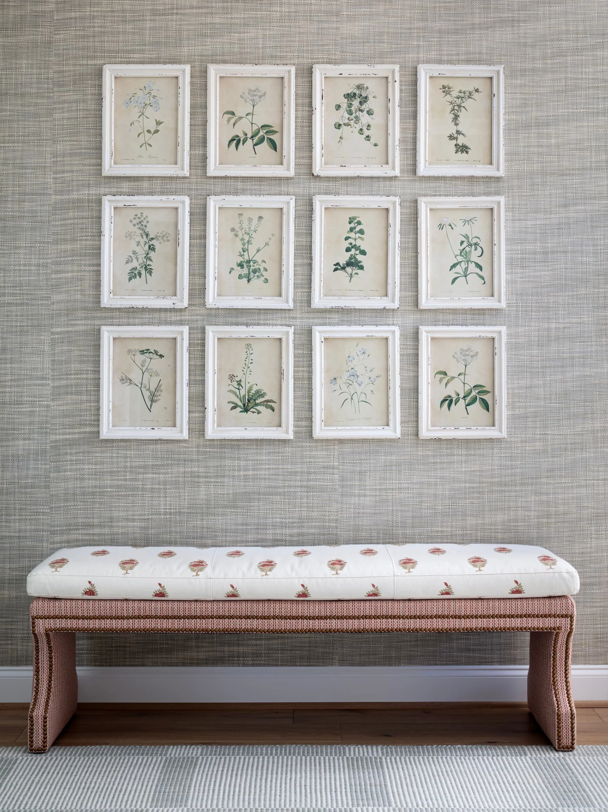 The primary suite is a calming retreat with walls wrapped in a pale blue paper weave. A favorite large scale botanical fabric frames the windows and grounds the layers of textiles used to create this cozy and collected space.
