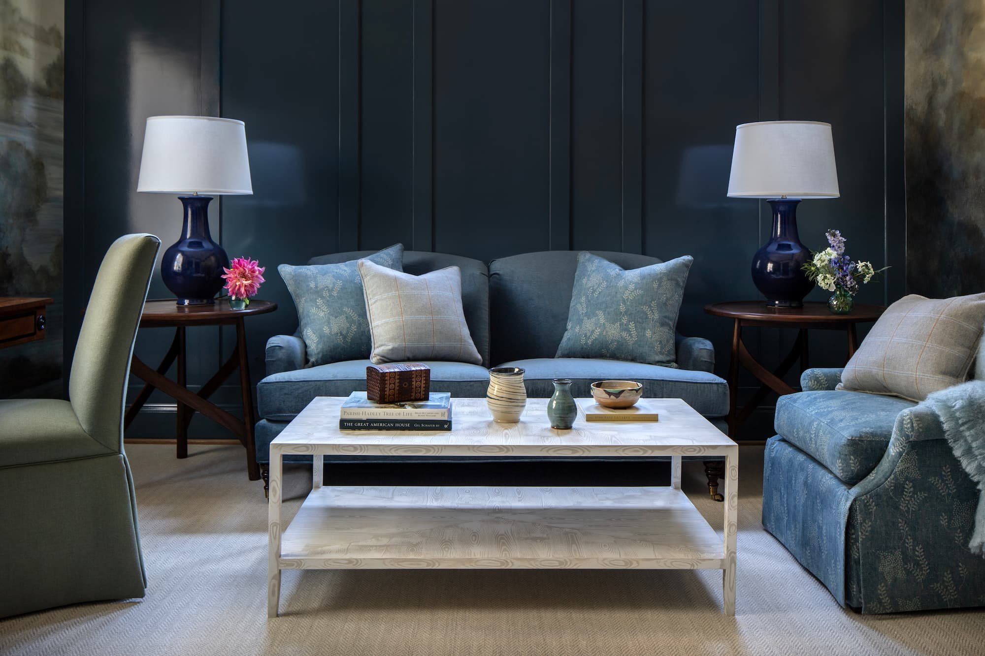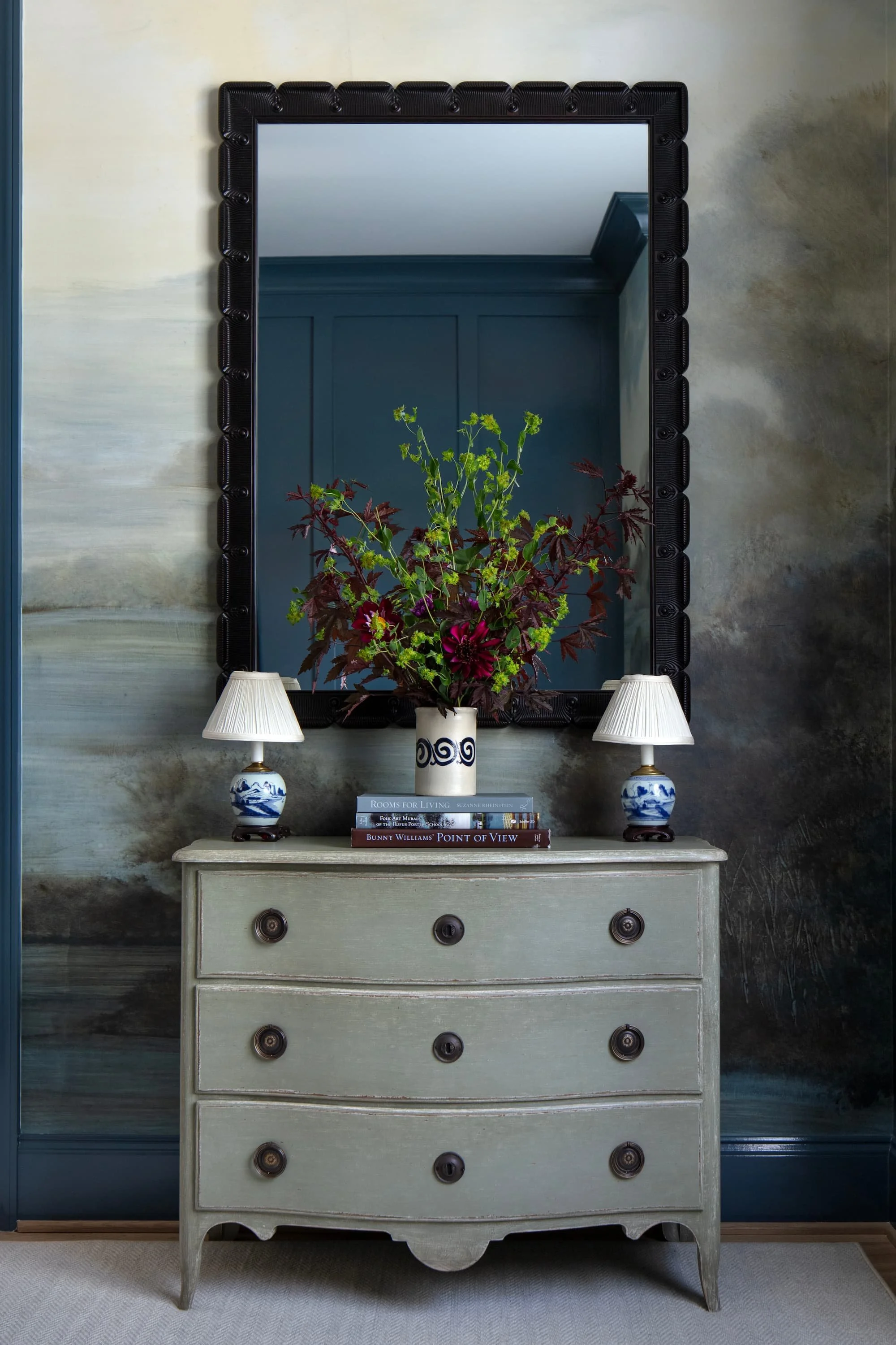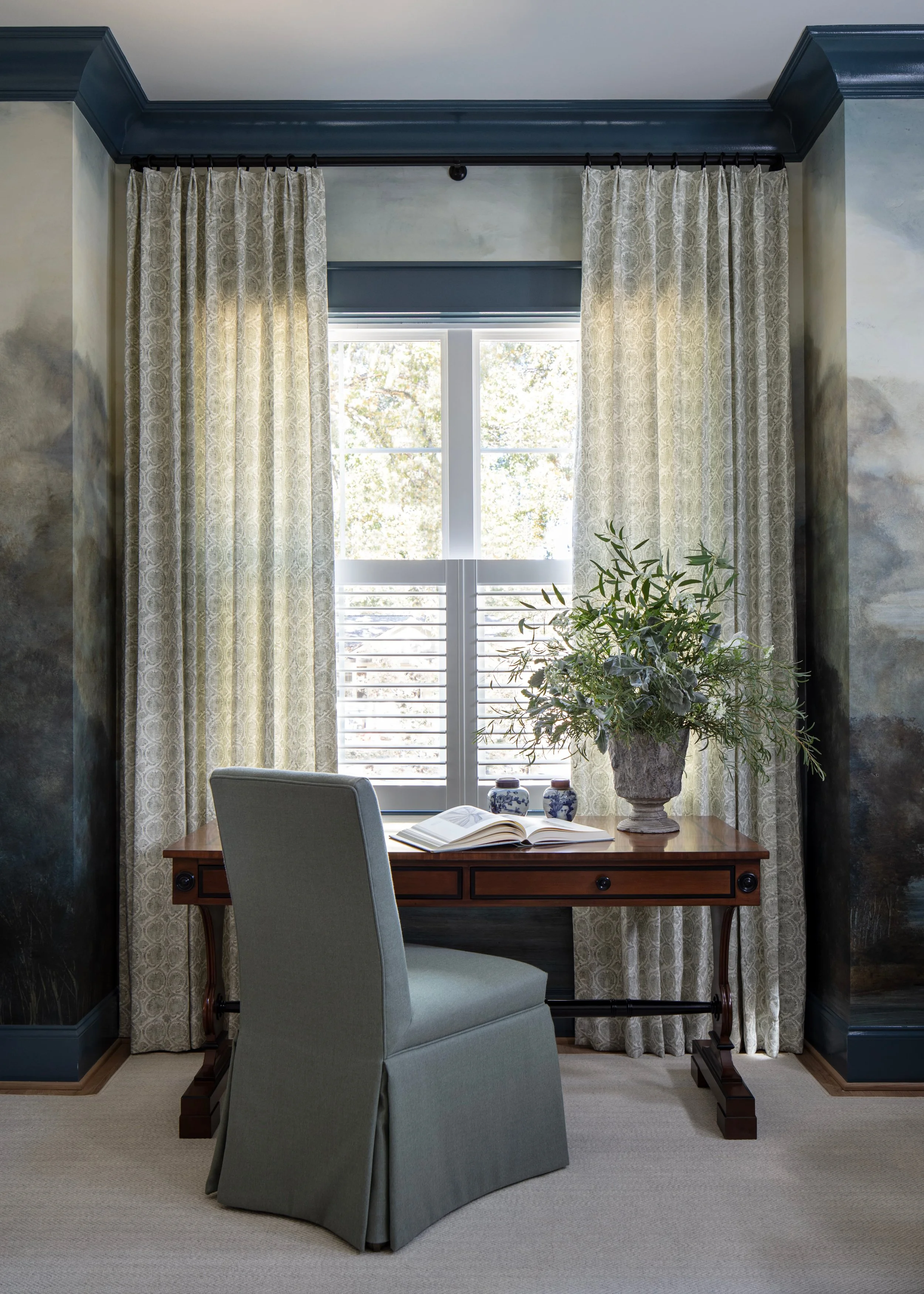 After connecting over a shared love of Maine, where our clients spend part of the year, we knew we wanted to give a nod to New England in their study. The murals of Rufus Porter provided the inspiration for the atmospheric wall mural which sets the tone in the dramatic space.